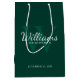Ajoutez une touche personnelle à votre mariage avec un sac cadeau pour groomsmen personnalisé. Ce sac cadeau contient le nom du marionnettiste personnalisé en style de police de script classique blanc avec des détails mariages en style de police serif classique blanc et monogramme en style de police serif classique vert émeraude clair en arrière - plan, sur arrière - plan vert émeraude. Parfait aussi pour le meilleur homme, père de la mariée, porteur de bague et plus.