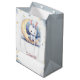 Super mignon sac cadeau avec mignon lapin blanc portant une belle arc bleue assis sur une belle lune avec quelques étoiles en chute d'or et quelques nuages bleus poussiéreux.