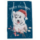 Chien Husky portant le casquette du Père Noël en flocons de neige sur arrière - plan bleu. La couleur Arrière - plan peut être modifiée. Le texte peut être modifié ou supprimé.