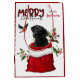 L'image à l'avant et à l'arrière de ce sac cadeau de Noël est l'image d'un mignon chiot Black Labrador Retriever qui sort d'un sac cadeau de Noël. Derrière lui se trouve une branche de baies saintes et rouges. Un bullfinch rouge et noir est sur le point d'atterrir. Stylisé rouge et noir buffle texte plaid dit MERRY CHRISTMAS". Votre propre signature est dans deux champs pour vous de customiser. Assurez-vous de voir les produits correspondants, y compris les ornements, dans notre magasin.