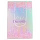 Un fond holographique licorne arc-en-ciel en rose, violet, or rose et vert menthe avec des gouttes de faux strass, aspect peinture qui coule. Personnalisez avec un nom et des initiales de monogramme. Le nom est écrit avec un style d'écriture manuscrite tendance. Peut être utilisé à la fois pour l'emballage cadeau et comme sac de faveur de fête pour les anniversaires, les enterrements de vie de jeune fille, les baby showers.