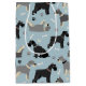 Les chiens Schnauzer mignons en noir, sel et poivre et les manteaux noirs et argent s'assoient, se tiennent et se retournent avec des os de chien éparpillés et des empreintes de pattes sur un arrière - plan bleu clair.