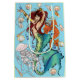 Sirène aux cheveux rouges portant des bijoux en or. La sirène a une queue turquoise, bleue et verte. Autour de la sirène se trouve un hippocampe, des méduses, des coquillages et des bulles d'eau, le tout en toile de fond bleu