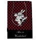 Ce sac personnalisable contagieux de cadeau d'oeil comporte une Alice dans le thème du pays des merveilles avec un motif noir et rouge classique de damier et le lapin blanc. Au centre il y a une image vintage du lapin blanc du travail célèbre de Carroll. Le lapin porte un dessus royal de châtelain orné aux coeurs et porte une trompette, le rouleau, et sa montre de poche. Le texte personnalisable indique "Alice au pays des merveilles" dans la copie cursive blanche. Frappez le bouton de personnalisation pour changer ou supprimer le texte, ou le bouton de personnaliser pour éditer la police ou la couleur de police. Fait un grande cadeau, décoration, ou article de partie pour des amants des motifs vérifiée et de damier, Alice au pays des merveilles, le lapin blanc, et des conceptions originales et élégantes. Cette conception est également disponible sur le papier de soie de soie, les autocollants, les coussins, et d'autres articles.