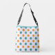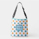 Allover sac fourre-tout d'impression avec une bande de bandes diagonales bleu et blanc sur le dessus et beaucoup de pois bleu et orange sur blanc avec une bannière décorative bleue que vous pouvez customiser facilement avec un nom.