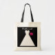 Ce sac de femme de chambre amusant présente une robe de mariée blanche moderne avec un bouquet de roses roses sur un arrière - plan noir. Le mot "femme de ménage" apparaît au-dessus de la robe de mariée. Une excellente façon de dire merci à vos servantes d'accueil fabuleuses. Copyright Kathy Henis