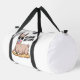 This white duffle bag features a charming cartoon llama wearing sunglasses and blowing a bubblegum bubble, with the text "NO DRAMA, JUST LLAMA." This quirky and humorous design is perfect for those who appreciate a peaceful, fun-loving attitude. Edit color of the bag caps and body in the Design tool to your favored colors.