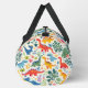 The image is a playful and colorful seamless pattern featuring a variety of cartoon dinosaurs in different poses. The dinosaurs are depicted in bright colors like red, blue, yellow, green, and orange. They are surrounded by stylized flowers, leaves, and foliage in a vibrant palette. The background is white, making the dinosaurs and plants pop. The overall style is cheerful, childlike, and whimsical, suggesting a design intended for children's products or textiles.