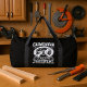 This black duffle bag features a bold declaration for skilled tradespeople: "I AM A CARPENTER I CAN'T FIX STUPID BUT I CAN FIX WHAT STUPID DOES." The design includes a hammer and wrench within a saw blade, making it a perfect humorous gift for any carpenter or builder. Edit color of the bag caps and body in the Design tool to your favored color