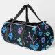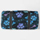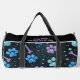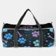 This stylish duffle bag features a unique celestial patterned bag with vibrant blue and purple paw prints, bones, and scattered stars on a sleek black background. It's a cute design pet accessory and versatile travel storage solution, perfect for any pet lover on the go.