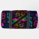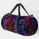 This image showcases a duffel bag with a highly textured and colorful leopard print. The individual spots are filled with a vibrant, almost pixelated or speckled gradient of colors, including various shades of blue, teal, green, yellow, orange, red, and purple. These bright, multi-hued spots stand out dramatically against the solid black background. The bag is equipped with dark, presumably black, carrying straps. This design gives the duffel bag a modern, energetic, and artistic appeal, perfect for making a statement while traveling or heading to the gym.