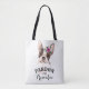 Ce sac fourre-tout à amusement a un bouledogue français mignon d'aquarelle brune et blanche avec un petit bouquet de pourpre, pêche, et fleurs vertes et feuille d'aquarelle se reposant sur son front. Le texte personnalisable indique le "pardon mon Frenchie".