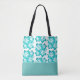 Ce sac fourre-tout est montré avec un design d'impression de fleurs tropicales mignonettes dans un dans les couleurs tropicales bleu-vert sur une couleur arrière - plan blanche avec une bande d'accent de couleur Aqua au fond. Taille moyenne affichée. A des sangles noires. Customisez cet objet ou achetez tel quel.