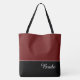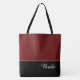 Ce charmant sac fourre-tout à la mode affiche le mot "Bride" en blanc sur fond noir avec le haut du sac en rouge Crab Apple personnalisé. Il y a beaucoup de place pour du texte personnalisé. Les graphiques et le texte sont sur les deux côtés de ce sac fourre-tout. Poignée noire. Personnalisez davantage ou achetez tel quel.