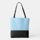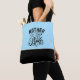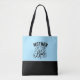 Ce charmant sac fourre-tout à la mode affiche l'impression "Mère de la mariée" sur une couleur personnalisée de noir avec la partie supérieure du sac fourre-tout dans une couleur personnalisée de bleu clair. Poignée noire. Taille moyenne affichée.