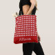 Un sac fourre-tout personnalisable avec des pois rouges et blancs. Ce design a été créé par Debbie Quick de Debs Creative Designs : www.debscreativedesigns.com