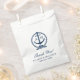 Le sac de faveur du mariage nautique "Merci" moderne preppy est muni d'un monogramme mariage affiché à l'intérieur d'une ancre de bateau avec cadre de noeud de corde, et texte personnalisé. Couleurs bleu marine et blanc.