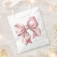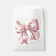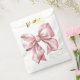 Un design de sac de faveur de fête charmant avec un grand nœud rose aquarelle centré sur le devant. Le nom de la future maman est affiché dans une police serif classique en bas, avec "Baby Shower" écrit élégamment en dessous dans une calligraphie manuscrite.
