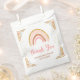 Ce mignon et capricieux sac de faveur baby shower dispose d'un arc-en-ciel boho, confetti et arrangements floraux avec l'herbe pampa dans les tons beige, rose et marron neutre. Le texte combine écriture manuscrite et polices sans serif pour un look élégant et moderne. C'est parfait pour un baby shower de printemps ou d'été. Graphiques par www.etsy.com/uk/shop/SunflowerDayLove