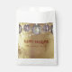 Ce sac à cadeaux personnalisable présente un fond doré brillant et somptueux parsemé de paillettes factices, rappelant l'éclat du champagne. En haut, cinq élégantes boules striées argent et bordeaux sont suspendues avec grâce. Le message "Joyeuses Fêtes" est bien visible dans une écriture festive rouge canneberge, avec un espace en dessous pour la personnalisation. Ce design luxueux capture l'éclat élégant d'une soirée de gala hivernal, ce qui le rend parfait pour les cadeaux de fête de fin d'année ou les cadeaux de Noël.