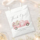 Elégante petite fille douche de fête de faveur sacs avec "Merci" dans un script avec un coeur swash et aquarelles d'un camion vintage transportant des citrouilles roses et crème et bouquets floraux.