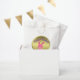Un adorable sac de faveur de Pâques (parfait pour les petits pour ramasser leurs mini-oeufs à la chasse aux oeufs de Pâques !) qui présente un petit lapin rose doux de Pâques avec une écharpe autour du cou. Au-dessus d'elle se trouve le salut en violet, 'Pâques heureuse' (qui peut être customisé pour convenir) et derrière elle se trouve un cercle doré brillant.
