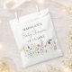 Un élégant baby shower floral privilégie les sacs avec une bordure inférieure de fleurs sauvages d'aquarelle et le feuillage dans les tons rose, jaune, violet, bleu et vert sur un arrière - plan blanc. Personnalisez le baby shower fleur sauvage sacs de faveur avec le nom de la mère à être et la date. Les sacs de fleur sauvage personnalisés sont parfaits pour les baby showers de printemps et d'été.