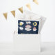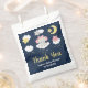 Ce mignon et capricieux sac de faveur comporte un adorable petit éléphant dans un arc rose assis sur un nuage d'étoiles tombantes. Dans l'arrière - plan est un ciel étoilé et une lune croissant. Le texte combine écriture manuscrite et polices sans serif pour un look élégant et moderne. C'est parfait pour un baby shower.