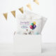 Le mignon éléphant en Casquette de fête avec ballons, corne et Confetti célèbre un anniversaire.