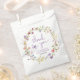 Un mignon bébé fille douche merci fête de faveur sac avec "merci" dans un script de lavande élégant et des aquarelles d'inspiration boho d'une couronne de fleurs sauvages violet, rose, pêche et jaune et un papillon violet. Personnalisez le nom et la date de la douche de la mère en lavande simple et en typographie grise.