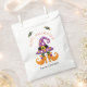 Ce mignon sac de friandise d'Halloween comporte des pieds de sorcière à bottes orange qui sortent d'une étoile casquette sorcière violet spangé. Des petites chauves-souris noires aux ailes vertes et dorées volent de chaque côté. Le texte orange dit "Happy Halloween" en demi-cercle. Un champ de texte supplémentaire se trouve en bas pour vous permettre de customiser. Mignonne, surtout pour les enfants, ou pour toute célébration d'Halloween. Graphiques de Prettygrafik Design, © Prettygrafik.com