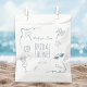 Ces illustrations de plage dessinées à la main ornent des sacs de bonbons pour une fête de mariage avec un fond blanc propre décoré de doodles bleutés au bord de la mer : vagues, coquillages, étoiles de mer, palmiers, lunettes de soleil et accents gribouillés mignons. Au centre du sac figure un texte personnalisable indiquant « Fête de mariage », avec un espace pour le nom de la mariée au-dessus et la date de l'événement en dessous. L'ensemble du design est modifiable, vous permettant d'adapter parfaitement les couleurs et le texte à votre fête de mariage sur le thème côtier tout en offrant à vos invités une présentation élégante et balnéaire.