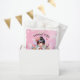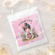 Fête d'anniversaire de la fille, merci pour les sacs de faveur. Petite fille asiatique mignonne assise dans des fleurs roses tenant une poupée.
