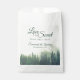 Ces beaux sacs de faveur sont parfaits pour une table de régal à votre réception de mariage. Ils présentent un design extérieur rustique avec une montagne couverte de pins verts et enveloppée de brouillard ou de brouillard. L'élégant texte du script dit "L'amour est doux s'il vous plaît prenez un plaisir" avec la place pour les noms du couple et mariage date.