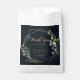 Ces sacs géométriques bleu or vert merci mariage sont parfaits pour un mariage simple. Le design présente de beaux feuilles verts peints à la main dans un arrière - plan bleu foncé, ornant un cadre géométrique doré. Customisez les sacs à gâteaux avec un bref message de gratitude, y compris vos noms et la date. Utilisez ces sacs pour compléter une réception de mariage, une douche nuptiale, tout événement ou fête. Le design sobre et élégant présente une typographie de script classique et sophistiquée en noir et blanc.
