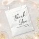 Cet élégant sac de remerciement de mariage comporte un script de calligraphie en lettres noires avec les mots "Merci" et vos noms et date mariage pour personnaliser sur un arrière - plan blanc simple. Conçu par Susan Coffey.