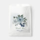 Sachet de faveur de mariage botanique magnifique avec des fleurs blanches romantiques, bleues poussiéreuses et bleues marine avec des feuilles vertes.