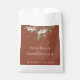 Ce design comprend un mariage en terre cuite un sac en papier de faveur modèle avec une élégante végétation fleurie, un script de calligraphie tendance, avec des lettres simples et minimalistes classiques, des noms de mariées et de mariés mariages, un feuillage feuille simple de fleurs blanches, une réception de mariage un service de faveur, un biscuits mariage bars desserts, une élégance simpliste rouille tons, un minimaliste classique un décor mariage design et créatif.