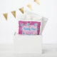 Belle fête d'anniversaire "Merci" privilégier sac avec des fleurs d'aquarelle rose, bleu et violet, tourbillons verts et morceau de parchemin pour votre texte, sur violet et bébé rose arrière - plan avec pois blancs. Joli, coloré, design girly, parfait pour la fête d'anniversaire fleurie du printemps/été.