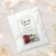 Ces magnifiques sacs de faveur de mariage sont une excellente façon de remercier vos invités d'avoir fait partie de votre journée spéciale. Le design se compose d'une seule rose rouge à long tige posée sur son côté et réfléchissant dans un bassin d'eau avec des ondulations et des vagues. La légende dit : Merci de célébrer avec nous. Il y a de la place pour les noms du couple et la date du mariage.