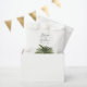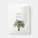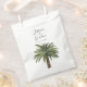 Un ensemble unique de sacs en papier sur le thème du palmier, spécialement adaptés à votre futur mariage sur la belle côte ou l'île. Elles présentent une illustration de style minimaliste d'un seul palmier. Au-dessus se trouvent les noms uniques de la mariée et du marié dans une police élégante de style cursif.