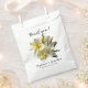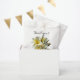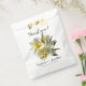 Sacs de faveur de mariage floral pour dire "merci" aux invités. Des fleurs de plumeria jaune et blanc design avec du texte au-dessus et au-dessous du bouquet réaliste de fleurs. Inclure les noms de la mariée et du marié avec la date du mariage. Les sacs blancs sont disponibles en séries de 50 en deux types de papier.