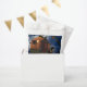 Une jeune fille au chapeau haut d'Halloween accueille une créature orange brillante dans le porche de son treehouse en forme de citrouille tandis que son chat calico se tient à ses côtés. Des branches d'arbres nus se dressent contre une nuit étoilée dans l'arrière - plan.