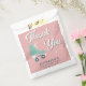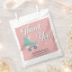 Un joli patinage à rouleaux rose pâle à la fête d'anniversaire favorise les sacs cadeaux avec "Merci" dans un script des années 70 et une illustration d'inspiration rétro d'un patinage à rouleaux bleu turquoise. Personnalisez avec son nom, son âge et sa date de fête dans une simple typographie bleue turquoise.