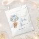 Ce design présente un ours en peluche convivial avec des ballons bleus et crème. Le texte "Baby shower" est écrit en police calligraphie moderne.