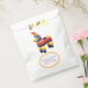 Sac de faveur en papier blanc amusant avec des graphismes d'une pinata âne colorée. Une zone de texte ovale bordée de pétoncle jaune, a un texte coloré prêt à être personnalisé pour votre événement de style fiesta.