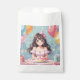 Jolie fille de dessin animé avec gâteau d'anniversaire et ballons à thème sacs de faveur d'anniversaire pour fourrer des bonbons dans pour dire merci aux invités. Arrière - plan rose, jaune et bleu.