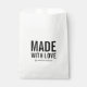 Sac de faveur élégant avec le mot "Fabriqué avec amour" en caractères gras et un script élégant pour votre nom ou nom de magasin en noir. C'est parfait pour vos produits faits main ou faits maison et favoriser les cadeaux. Il est facile de personnaliser ; vous pouvez remplacer le texte de l'espace réservé pour ajouter vos propres informations. Pour plus d'options comme changer la police et sa taille, cliquez sur le bouton "Personnaliser". *Veuillez noter que le filigrane Zazzle qui apparaît dans l'aperçu du zoom n'apparaîtra PAS sur le produit imprimé final © Rosewood et Citrus