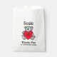 Ce sac de faveur comporte un ours en peluche avec un coeur qui comprend l'âge d'anniversaire au-dessus du Merci. Tout le texte peut être customisé pour s'adapter à votre événement. Le numéro de l'anniversaire peut être ajouté au coeur ou laissé vide.