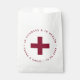 Pour le kit d'urgence (aka kit de survol) à mettre dans un sac d'accueil de mariage de destination, avec un peu de médicament à l'intérieur. Il a une croix au centre et du texte voûté faisant un cercle autour. Au-dessus, il y a le message "En maladie et en santé" et en-dessous il y a les noms de la mariée et du marié et la date. Le texte est en petits casquette. Le texte et la croix sont bordeaux, l'arrière - plan est blanc.